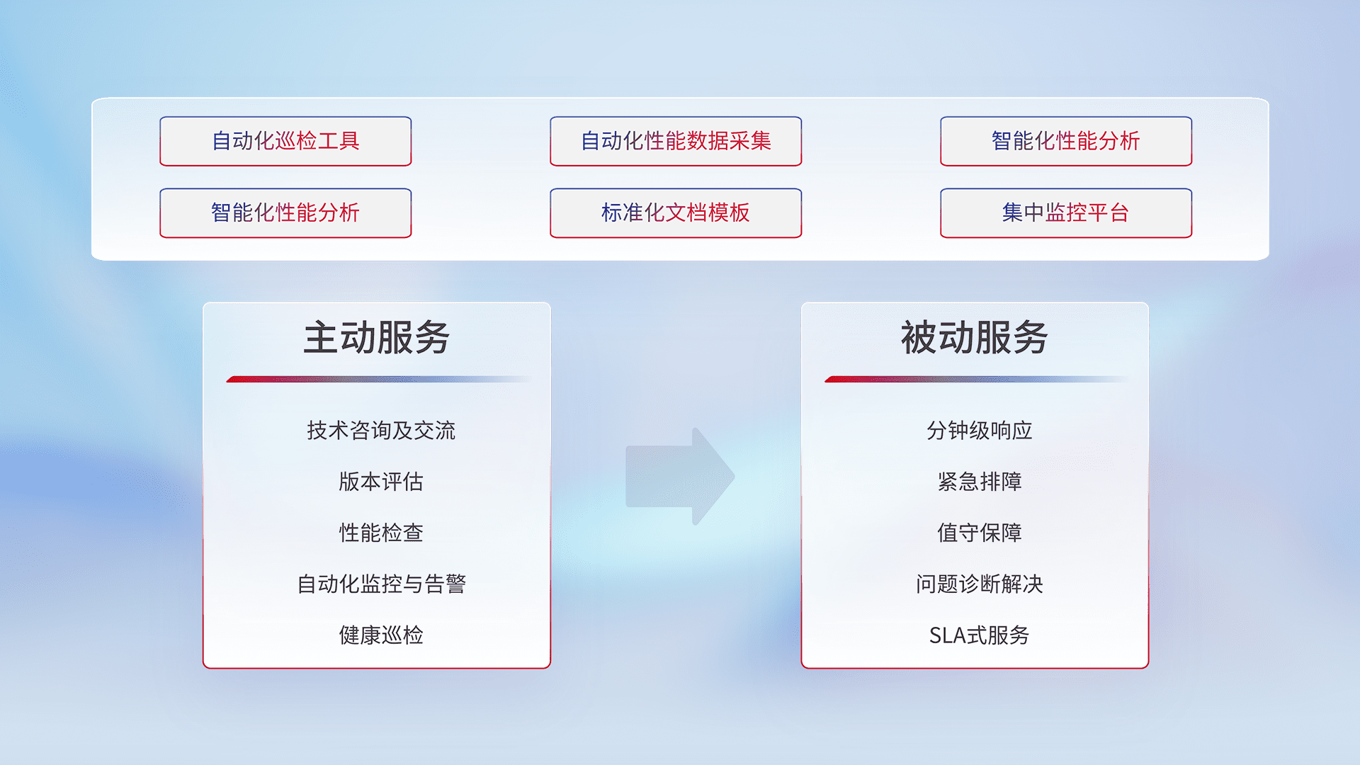 智能化工具和标准化文档,,,,保障服务质量,,,提供主动服务(包含技术咨询、、版本评估、、性能检查、、、、自动化监控与告警、、、、健康巡检)和被动服务包含(分钟级响应、、、紧急排障、、、、值守保障、、问题诊断解决、、SLA服务)。。。