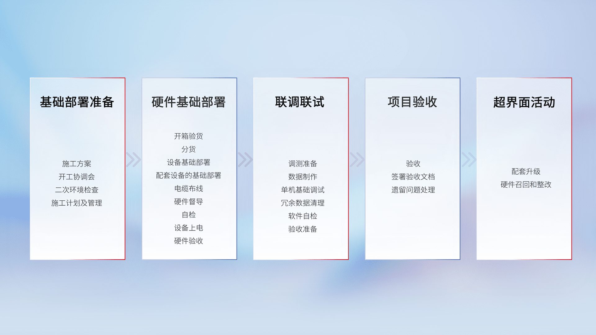 从基础部署准备、、、硬件基础部署、、、联调联试、、、、项目验收、、、、越界面活动的全过程可追溯,,保证施工质量和进度。。。